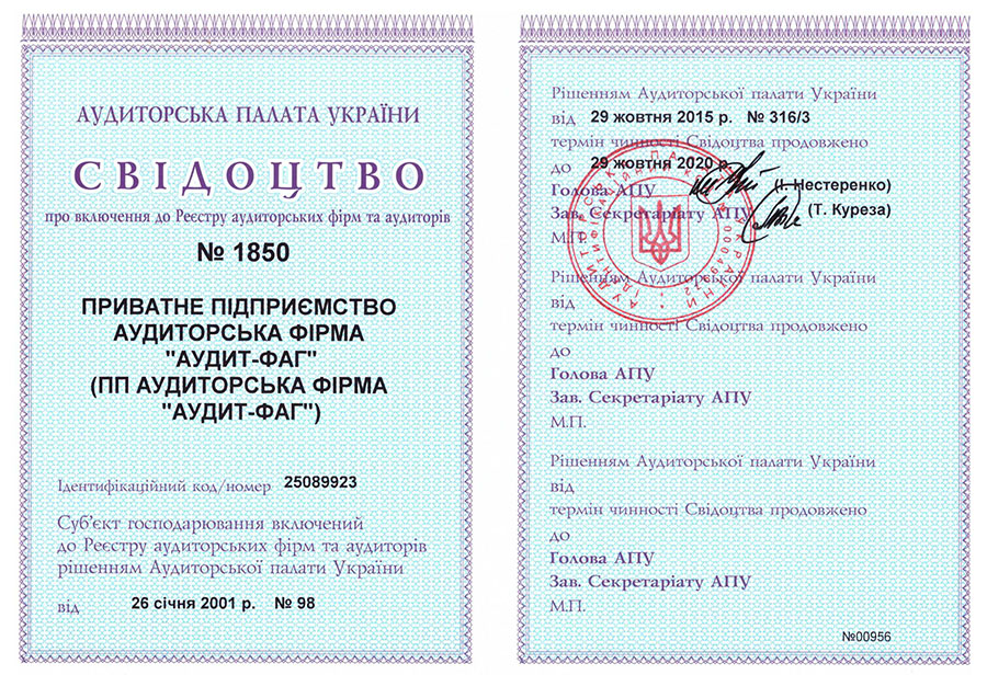 Наша фірма успішно працює на ринку аудиторських, бухгалтерських та консультаційних послуг з 1997 року. Свою професійну діяльність ми здійснюємо на підставі Свідоцтва АПУ № 1850 від 26.01.2001р.