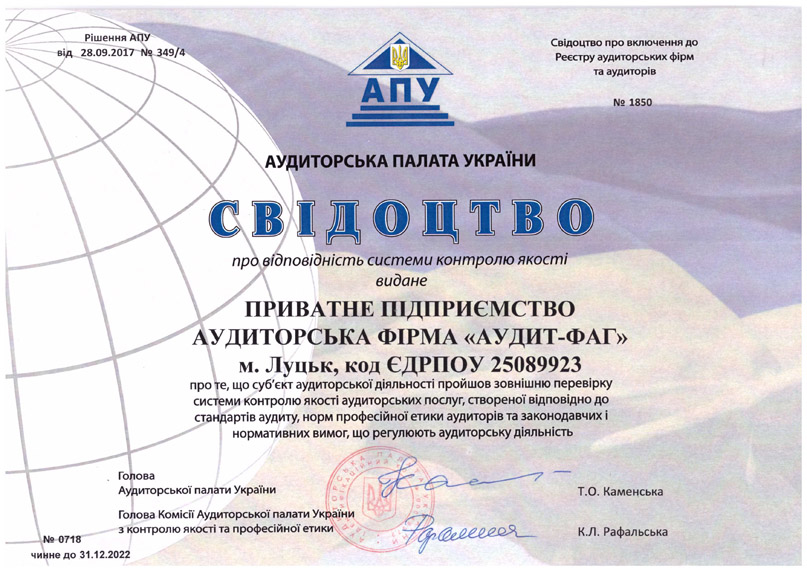 Аудиторська фірма «Аудит-ФАГ» пройшла перевірку контролю якості, що підтверджує високу якість послуг, які ми надаємо.