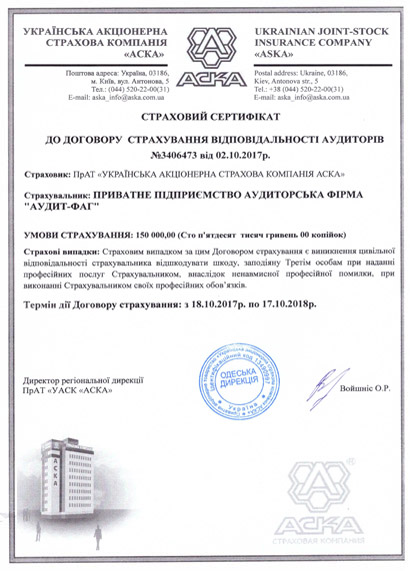 Аудиторською фірмою «Аудит-ФАГ» застраховано професійну відповідальність своїх працівників. Це дозволяє нам бути сучасною компанією, що дбає про свою професійну репутацію на ринку.